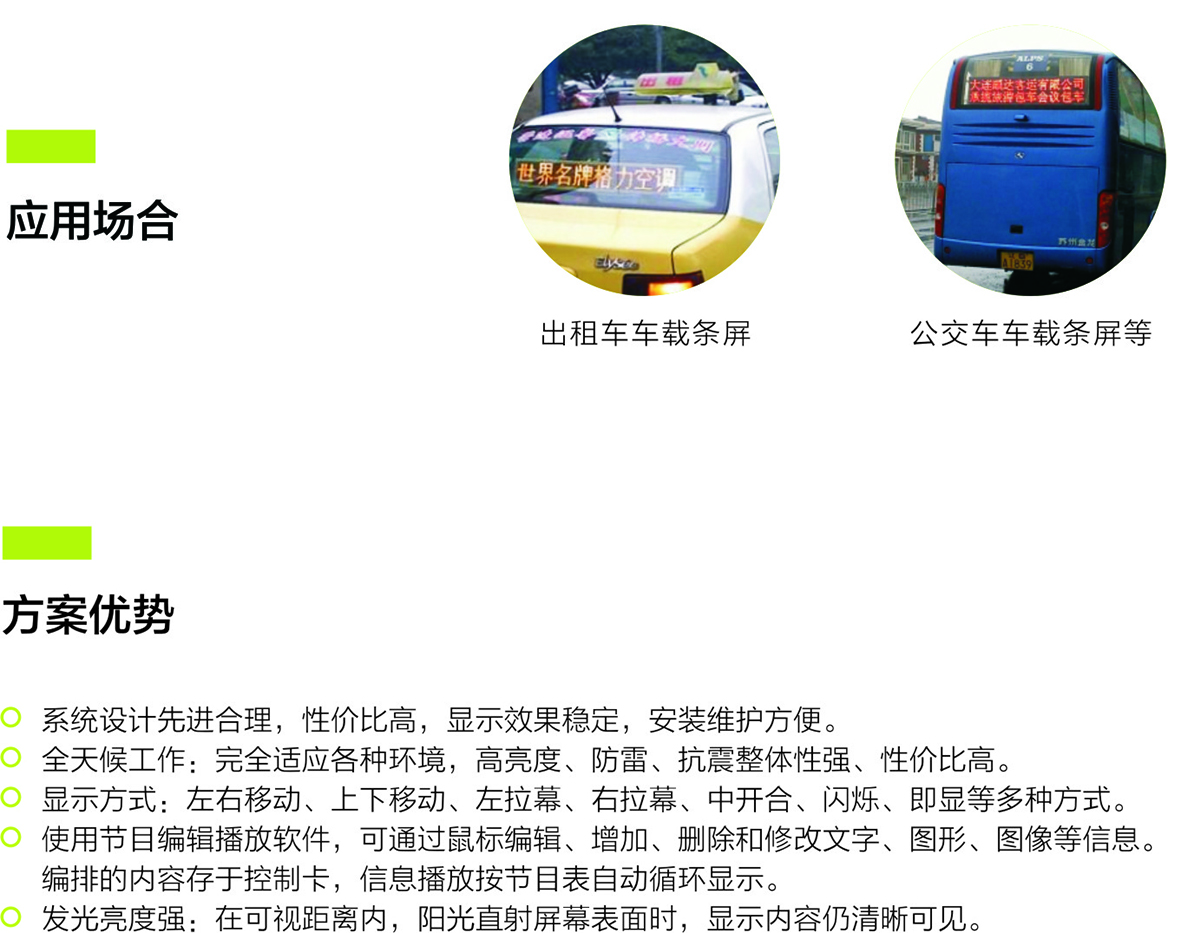 出租車車載無線LED顯示屏系統主要由車載LED顯示屏、無線LED控制卡、LED顯示屏控制軟件組成。配合城市出租車管理系統,可以顯示車輛信息,線路以及氣象,公告,廣告等媒體信息。