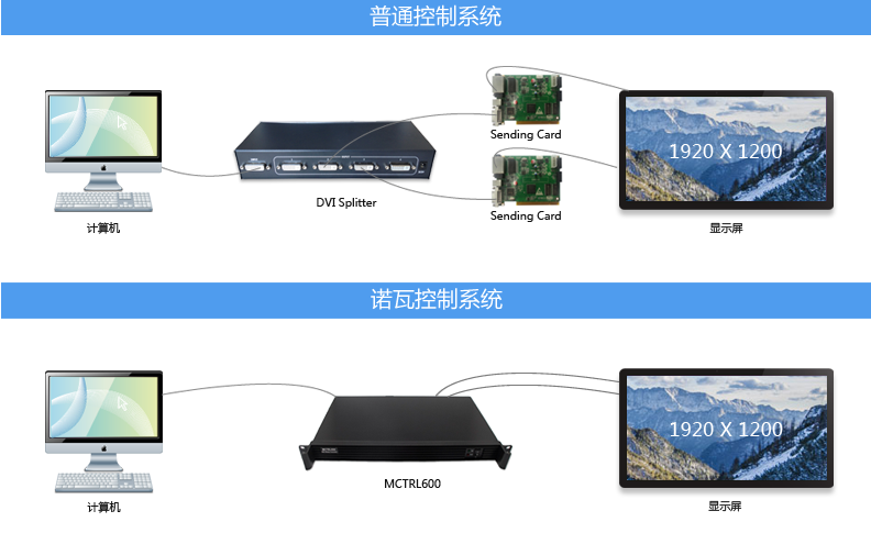 對(duì)于1080P全高清顯示屏,普通控制系統(tǒng)需要多臺(tái)設(shè)備,而用MCTRL600,一臺(tái)就夠了,系統(tǒng)架構(gòu)大大簡(jiǎn)化。