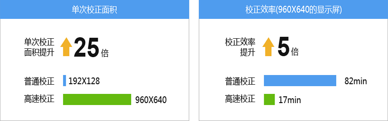 對(duì)于校正耗時(shí),以960X640的顯示屏為例,普通的校正模式下,需要82分鐘,采用高速校正,僅僅需要17分鐘,校正速度提升5倍!
